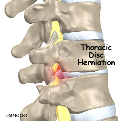 Although people often refer to a thoracic disc herniation as a slipped disc, the disc doesn't actually slip out of place. Rather, the term herniation means that the material in the center of the disc has squeezed out of the normal space. In the thoracic spine, this condition mostly affects people between 40 and 60 years old.